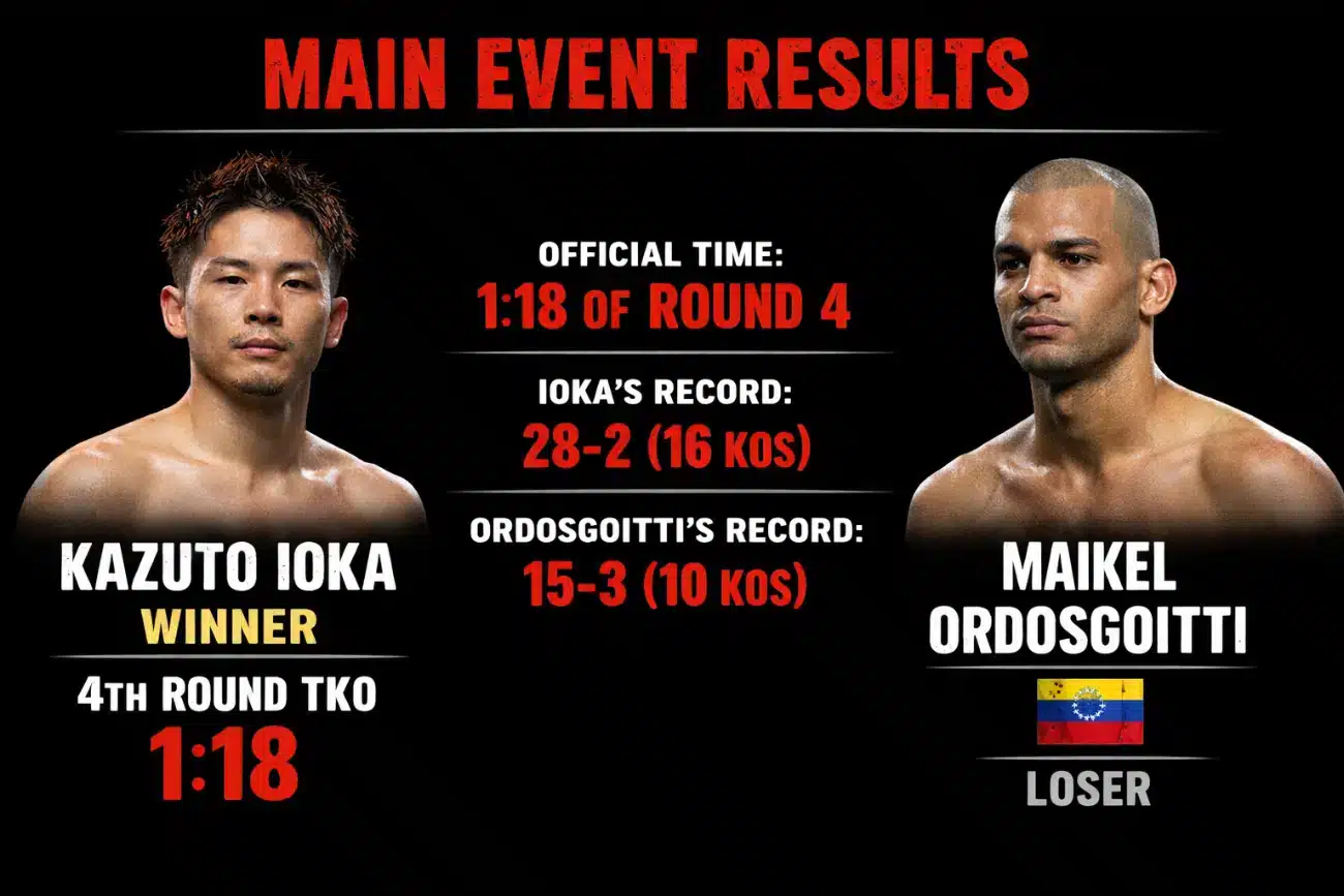 Fourth came fast. Ioka doubled the jab, slipped left, dropped the shot that finished it. Same left to the body. Cleaner. Ordosgoitti went down and stayed there, arms tight, head low. Ref didn’t bother counting. You could tell it was finished before he hit the floor.